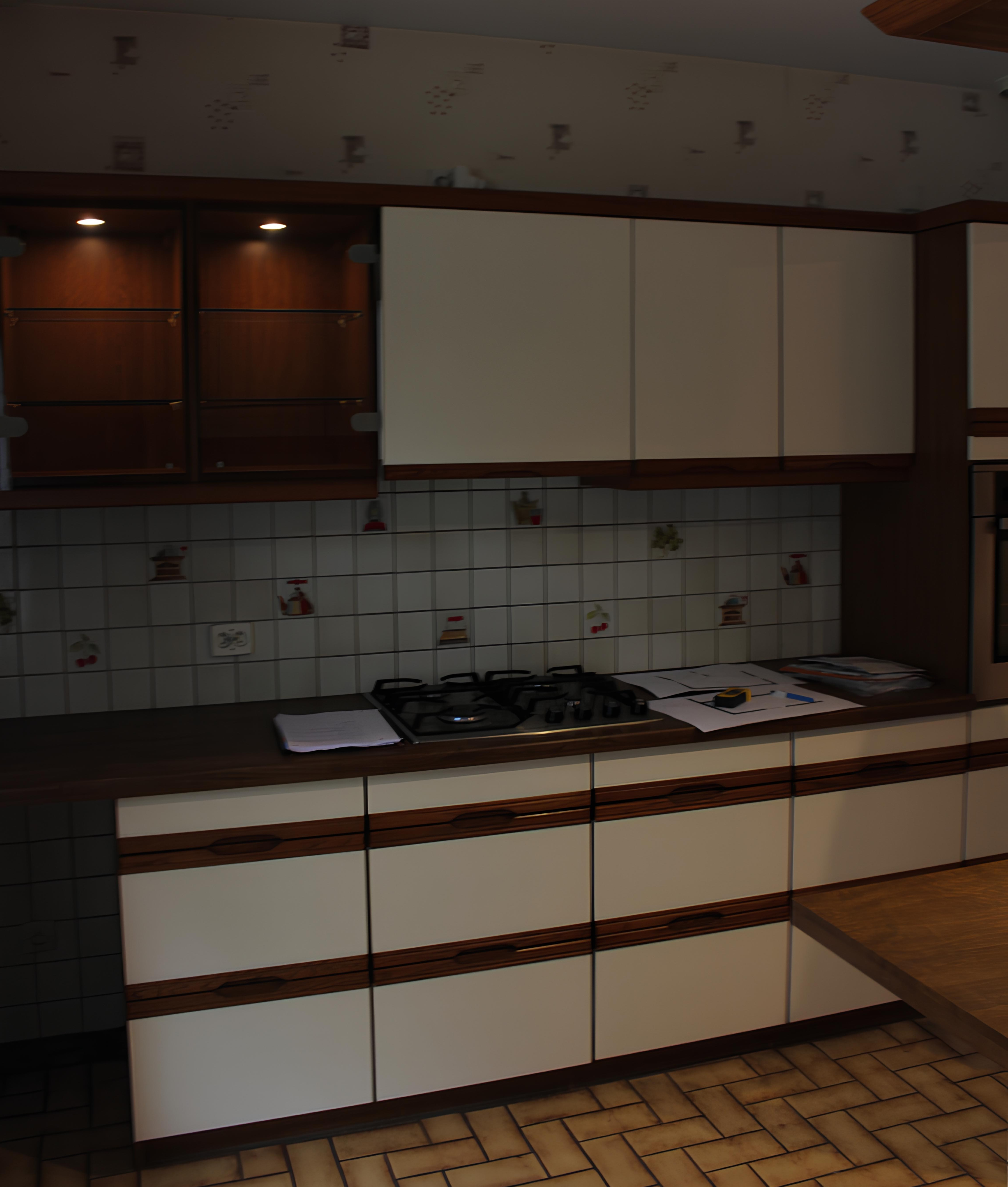 Fonctionnel et élégant, l’espace intègre un bureau assis-debout, un plan de travail en marbre aux veinures bleues, un évier encastré, un mini-frigo intégré dans les meubles sous plan et un tiroir de rangement dissimulé sous une marche d’escalier.