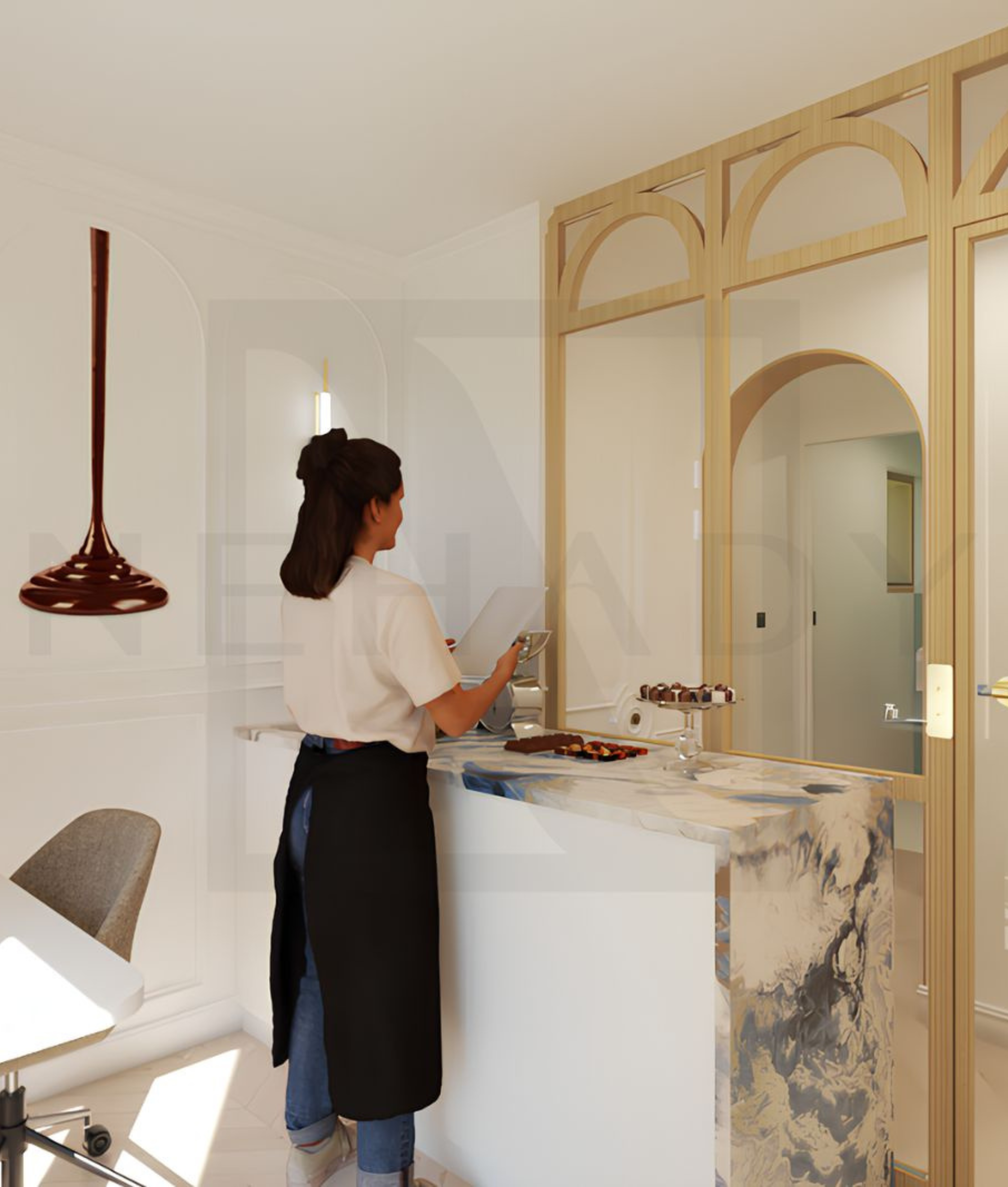 Pensé autour de l’univers du chocolat, ce bureau rend hommage à la passion de la cliente, pâtissière dans un restaurant étoilé, en pleine création de sa propre entreprise.