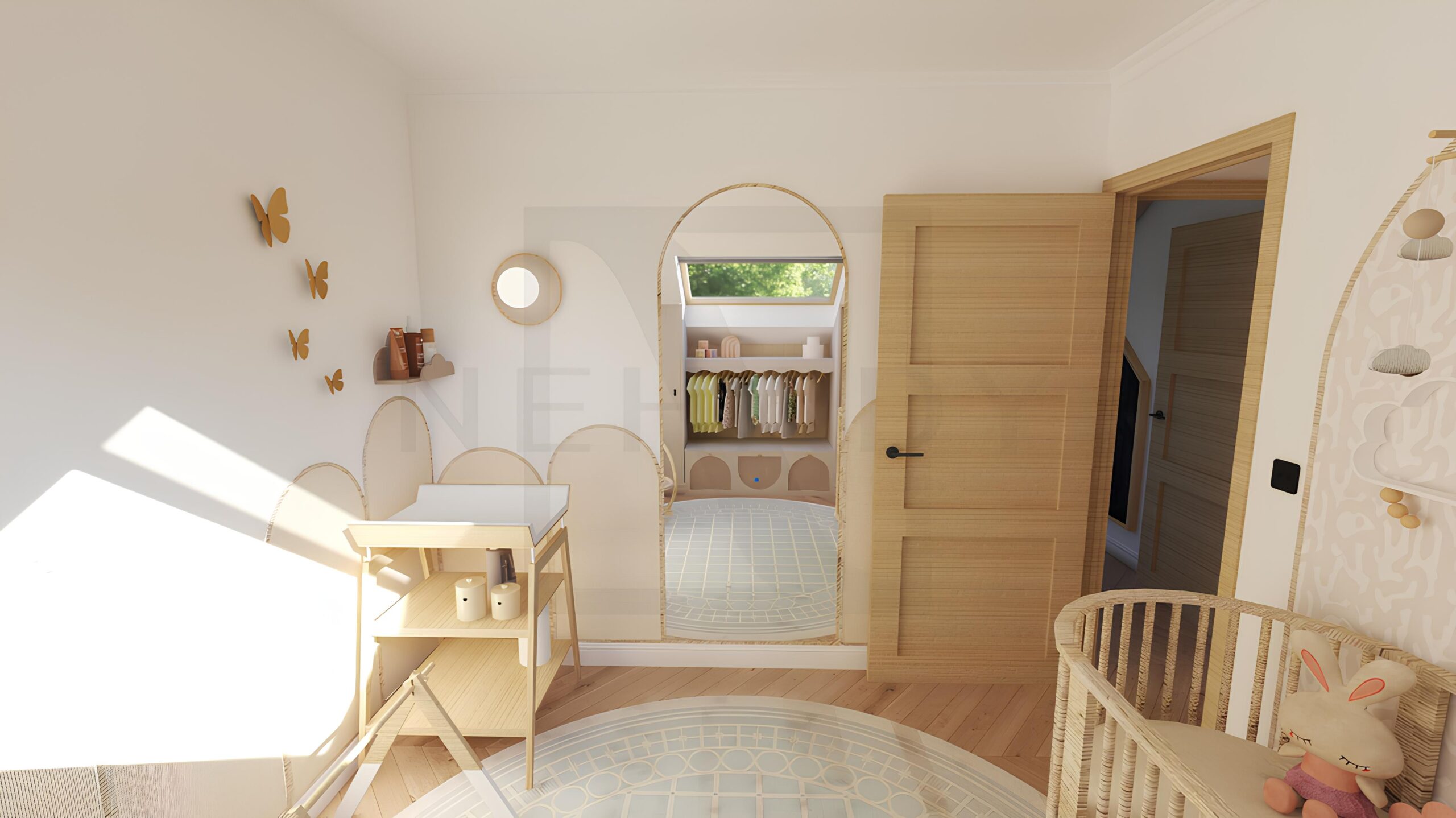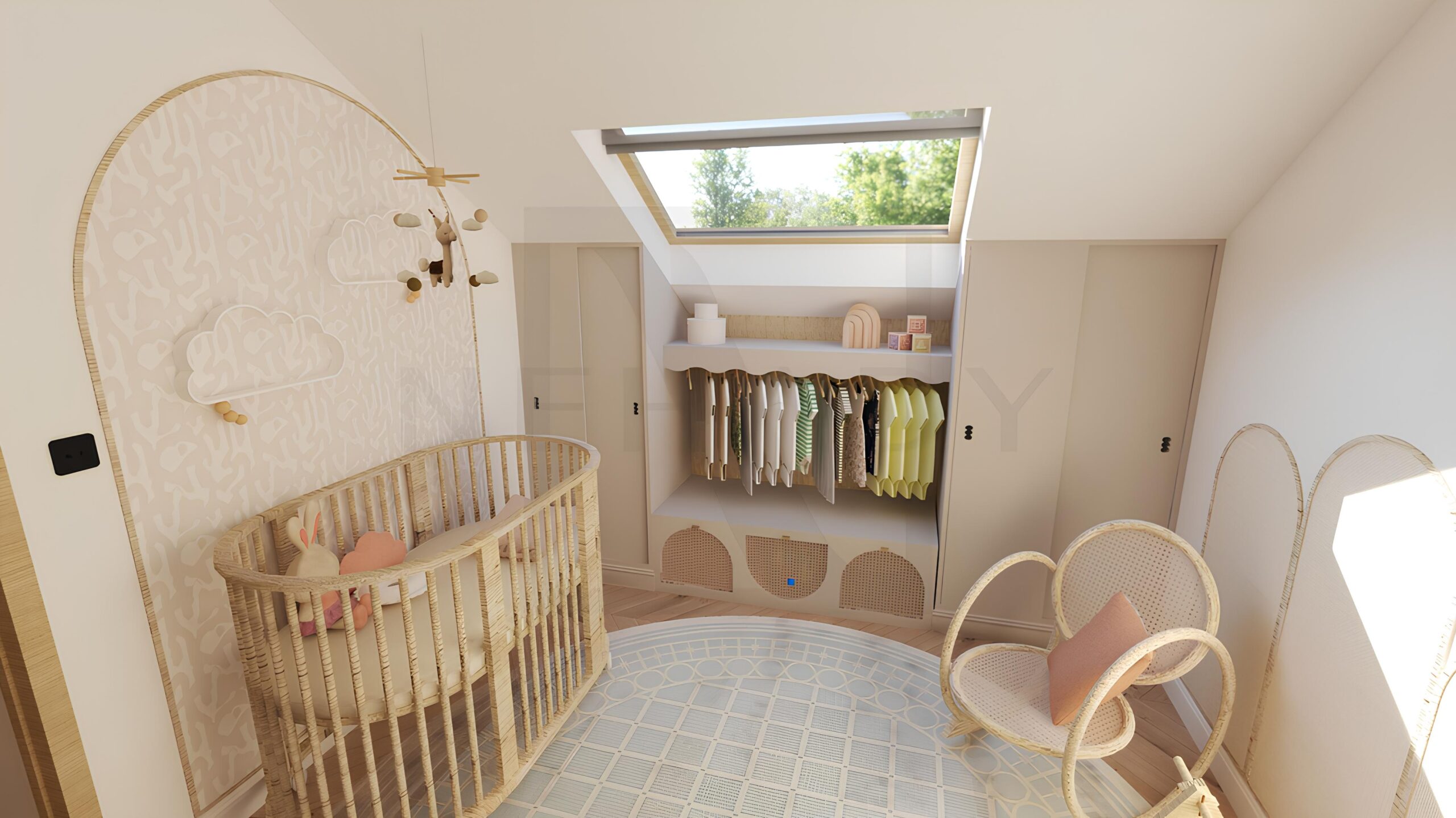 Sous la pente, des rangements intégrés avec une penderie ouverte facilitent le quotidien des parents. Un grand miroir vient visuellement agrandir l’espace, renforçant luminosité offerte par la fenêtre de toit.