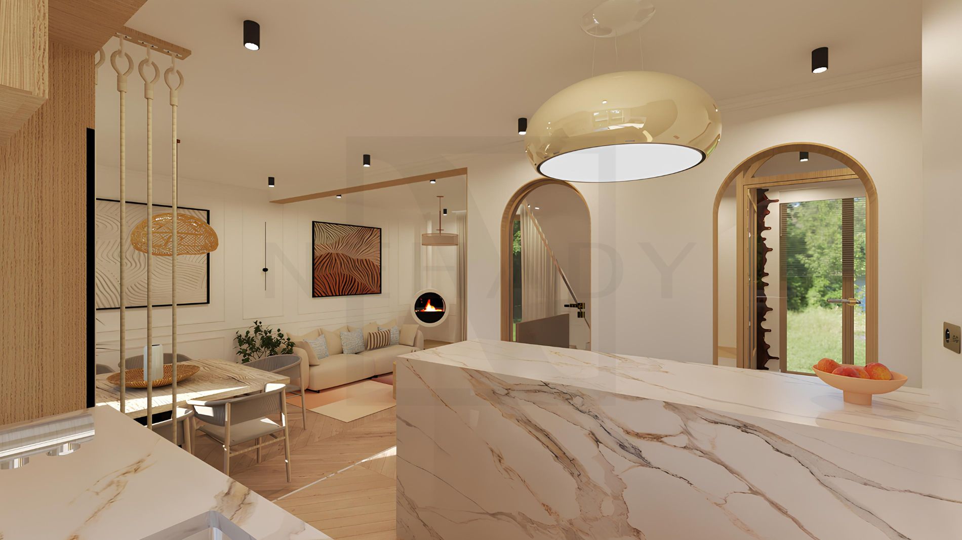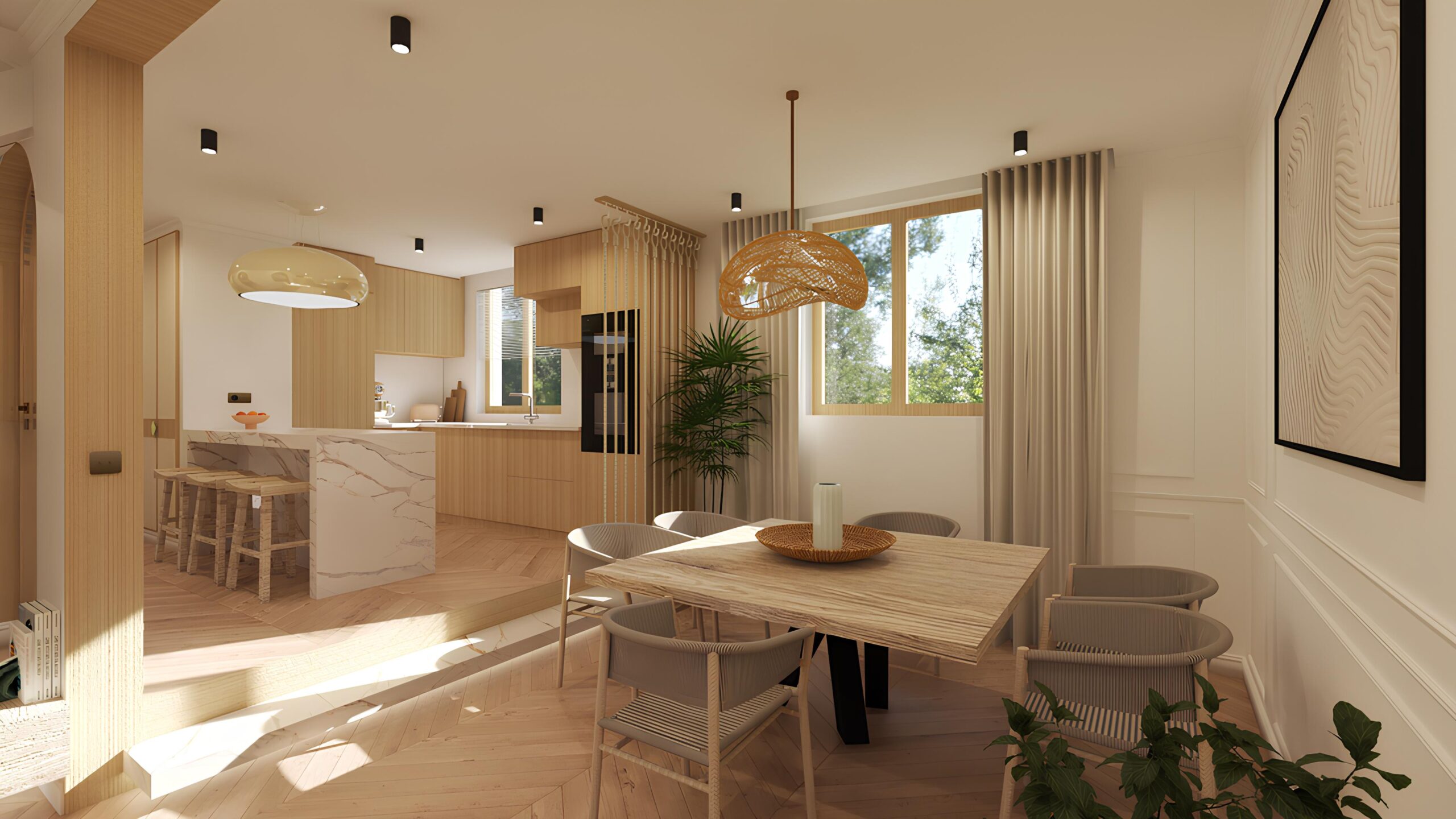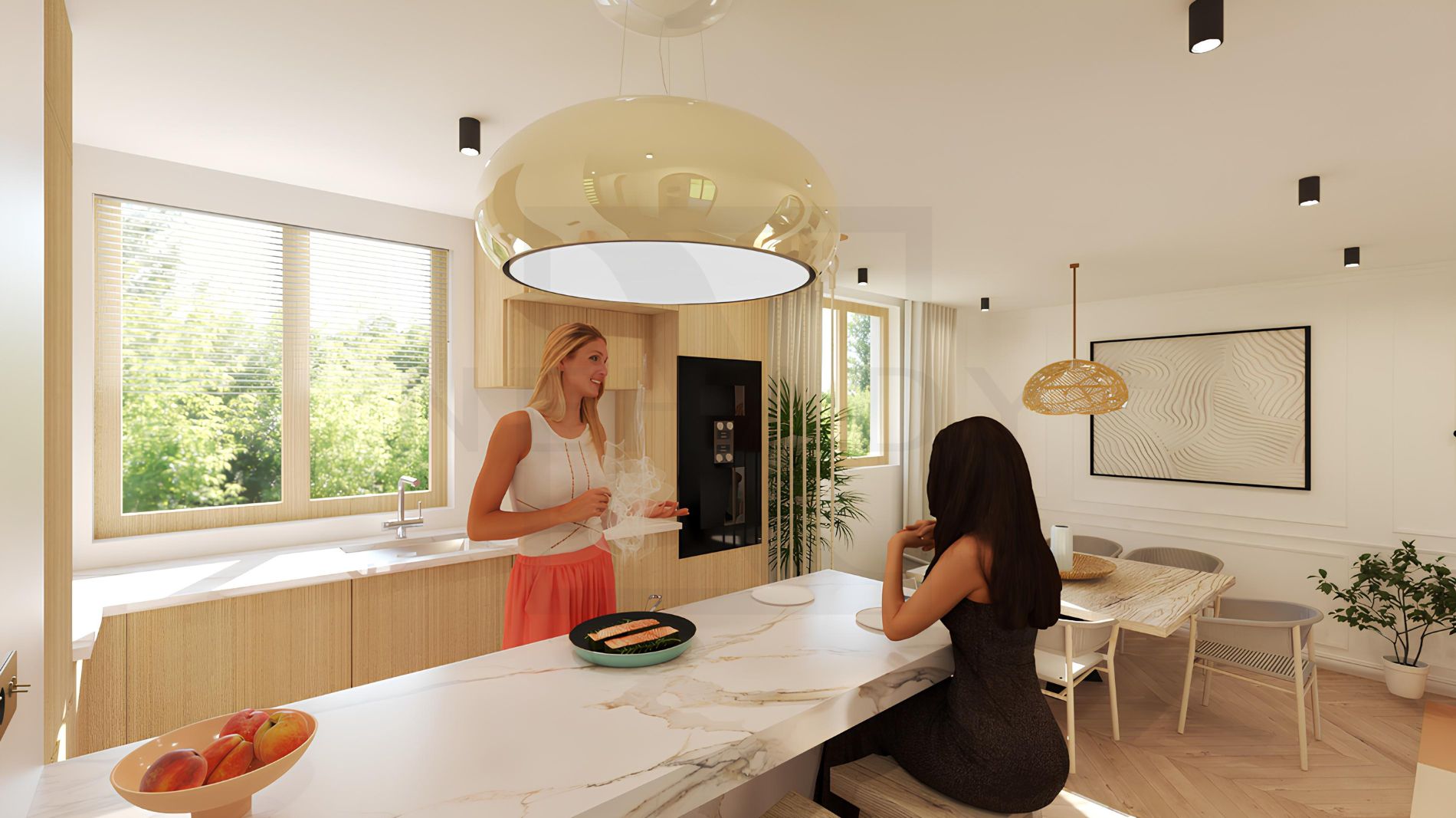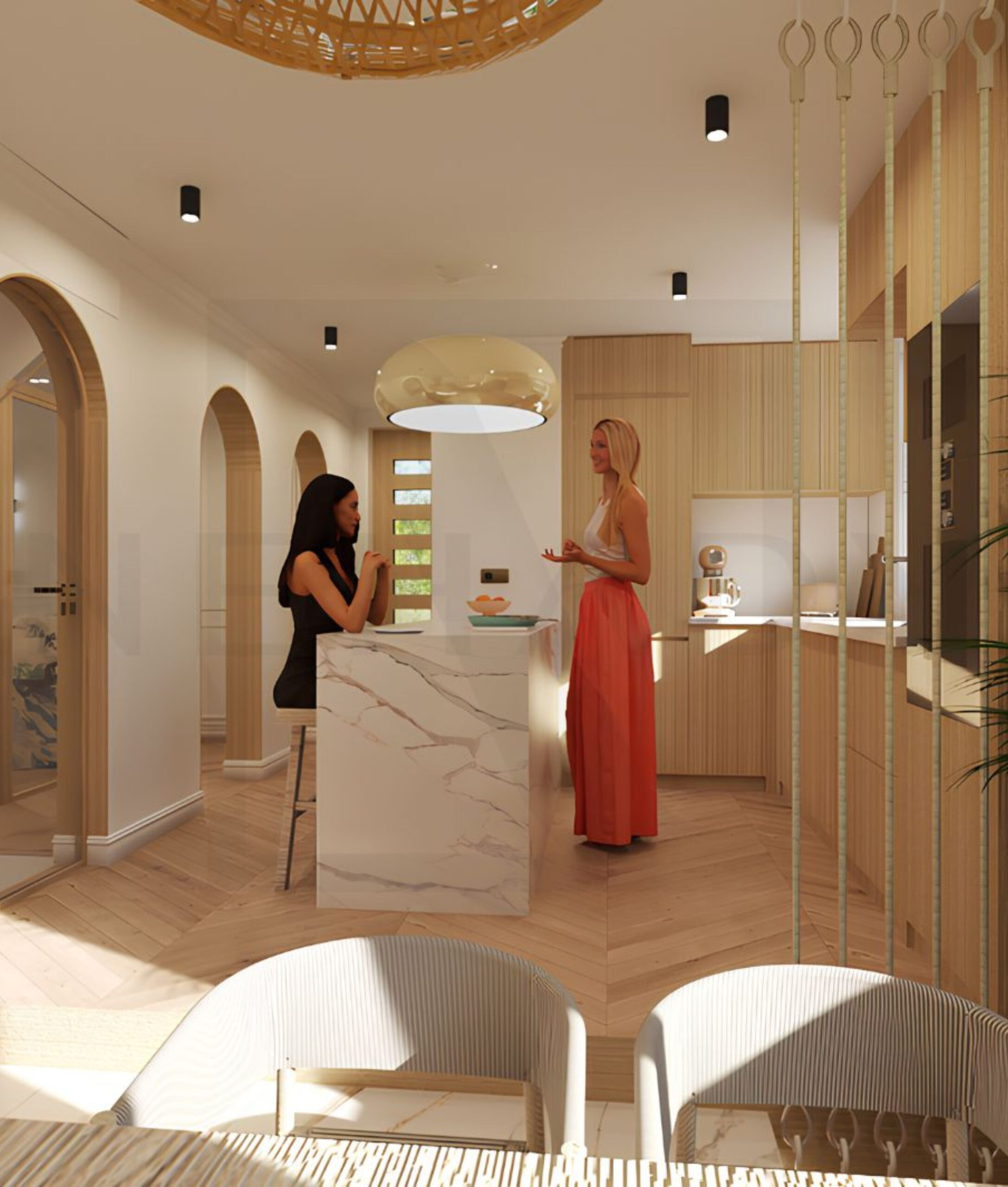 Conçue comme un espace ouvert et lumineux, la cuisine s'organise autour d'un plan de travail en marbre effet Calacatta, intégrant une plaque de cuisson à induction invisible pour un rendu minimaliste et épuré.