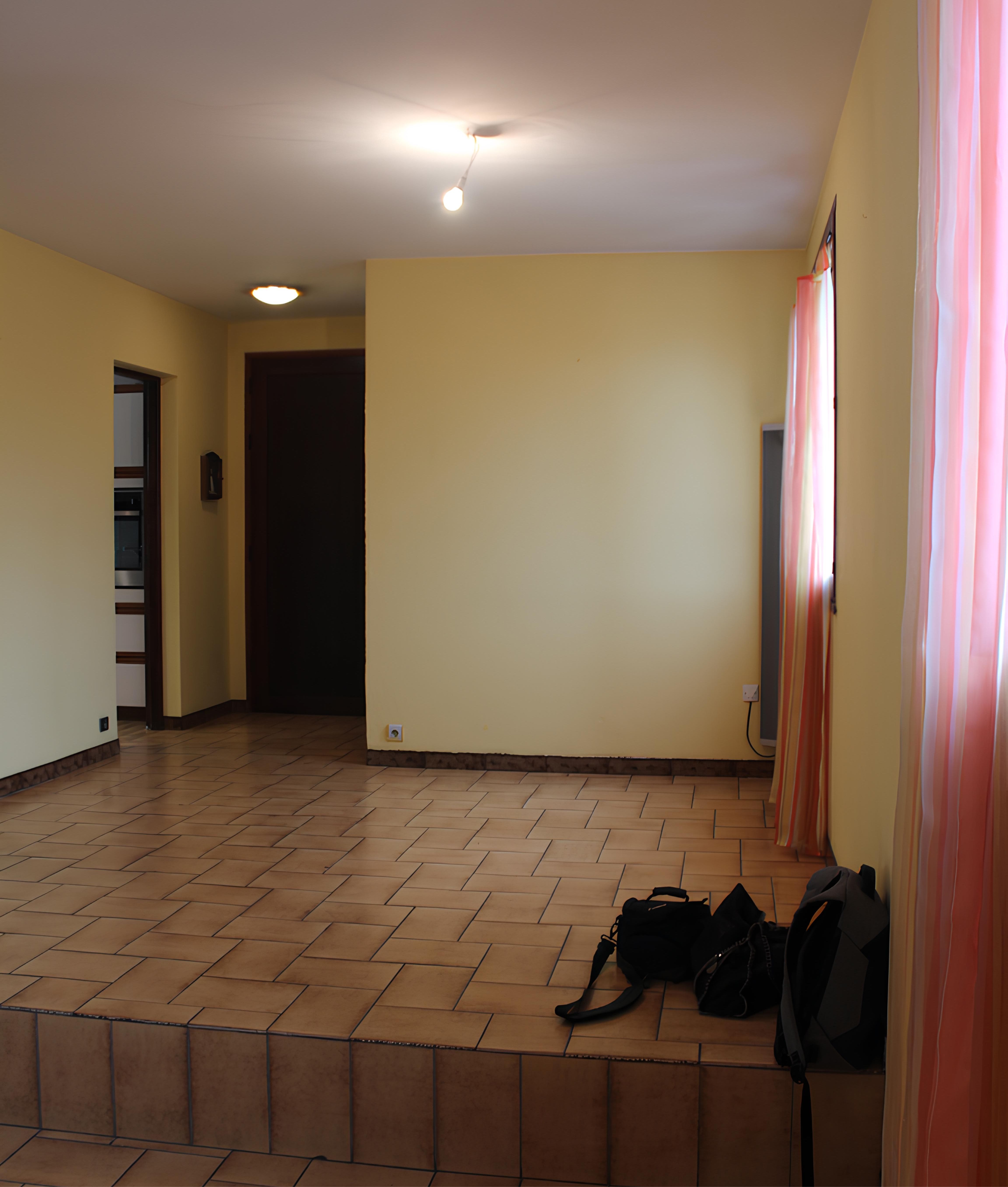 En plus de la différence de niveaux entre les deux espaces, une cloison légère en corde vient discrètement séparer la cuisine de la salle à manger.