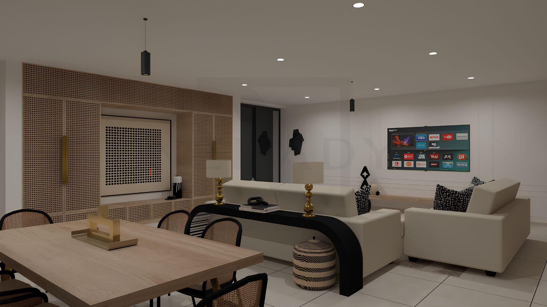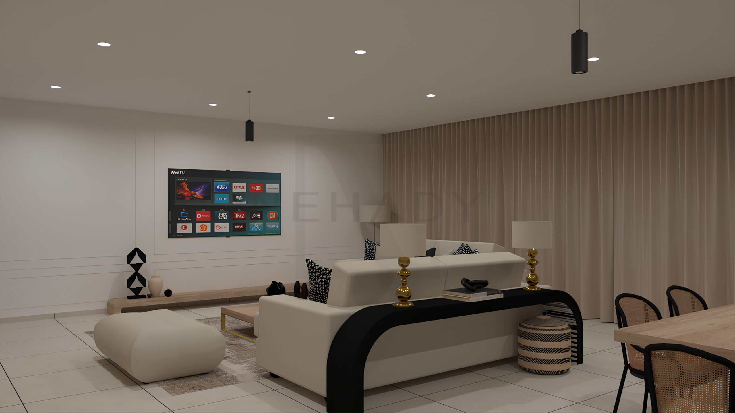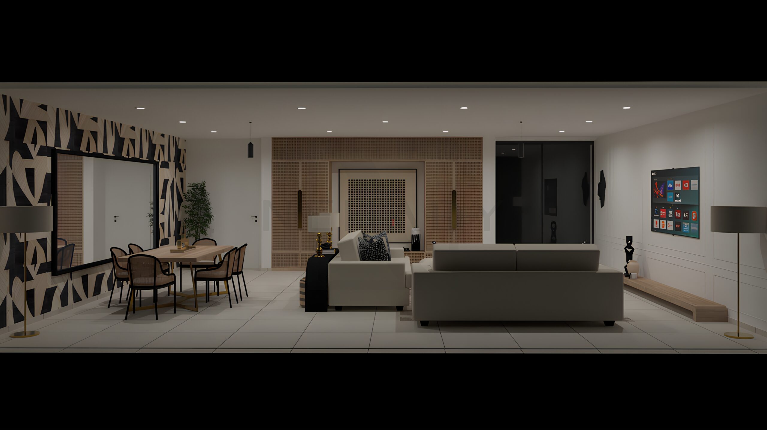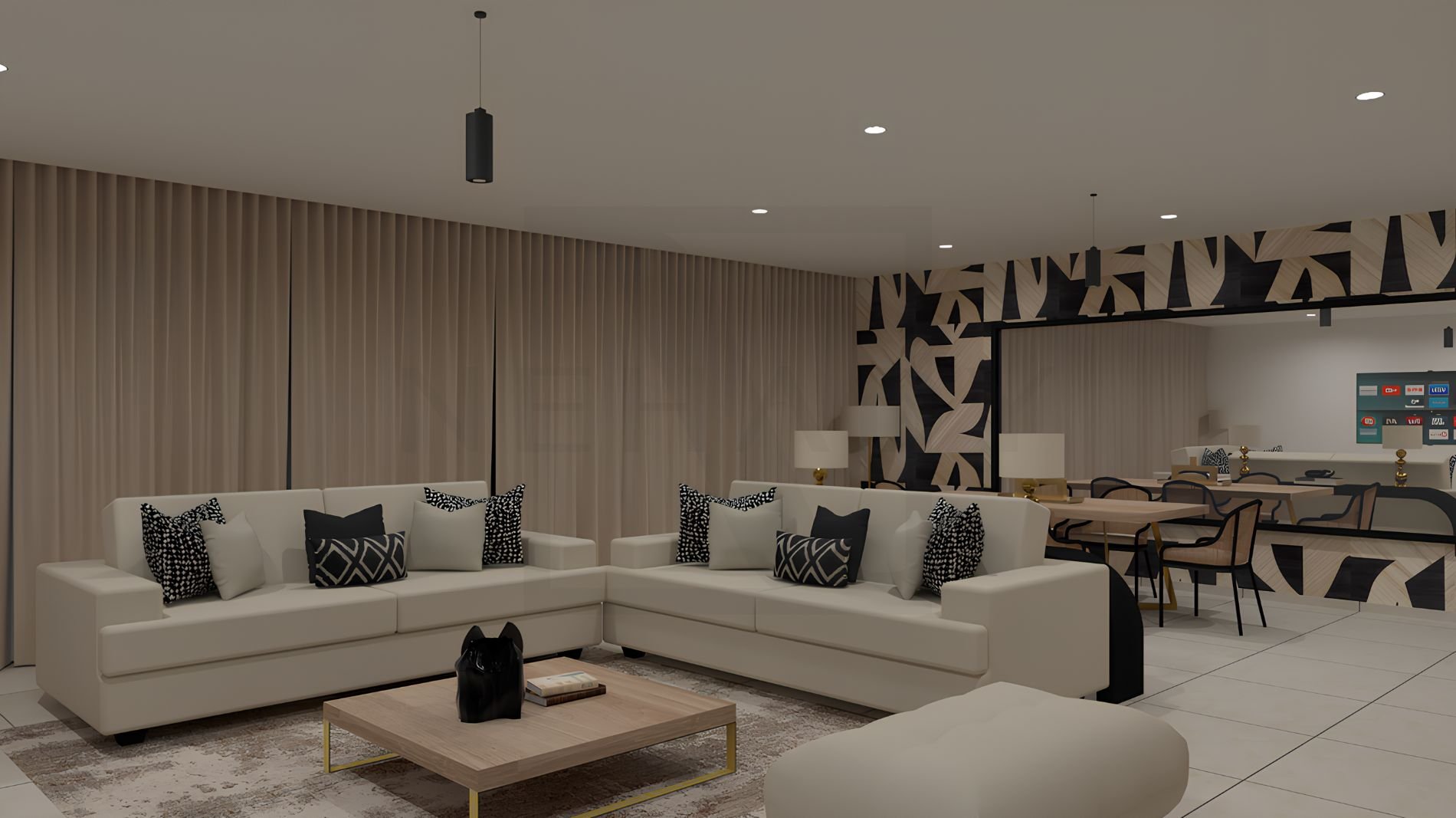 Ce projet de décoration d'un salon de 67m2 incarne une esthétique à la fois contemporaine, chaleureuse et élégante. L'espace s'articule autour de matières naturelles, contrastes subtils et d'une composition graphique forte.