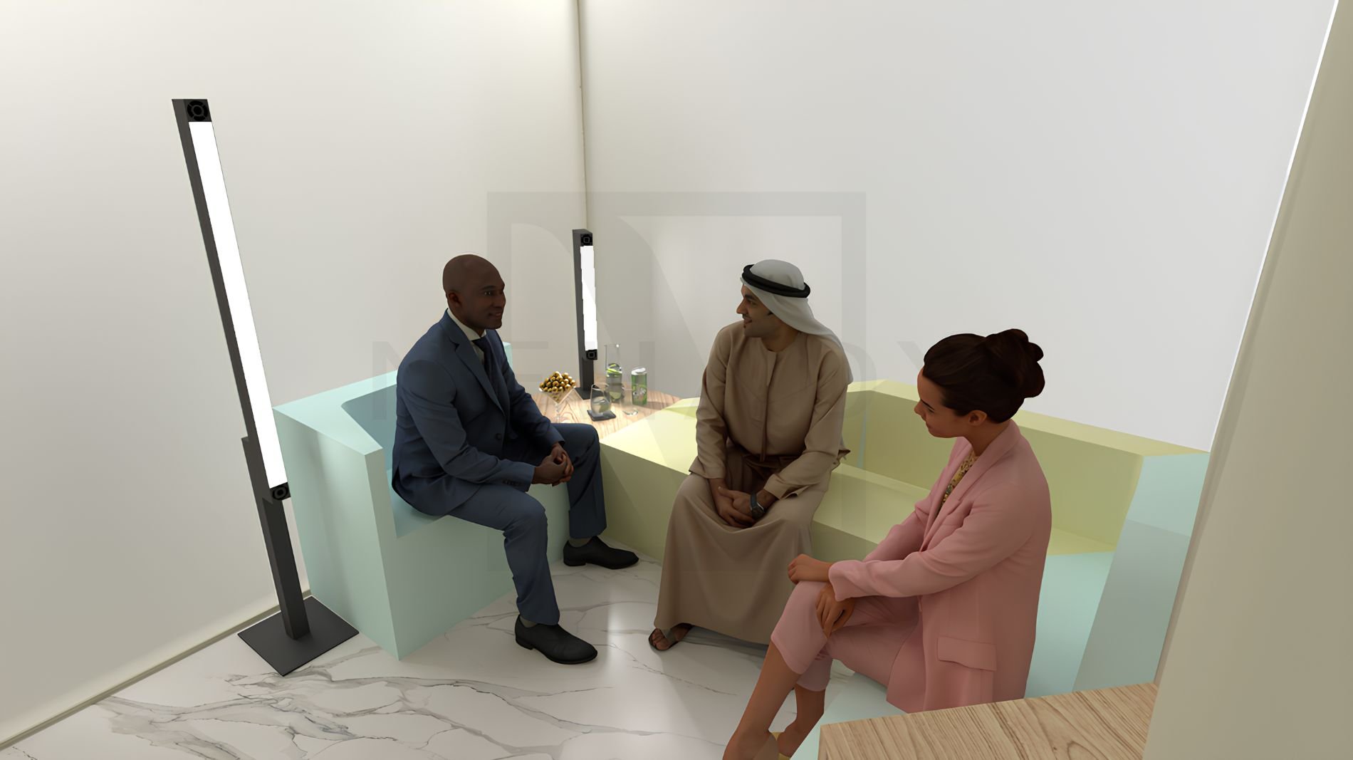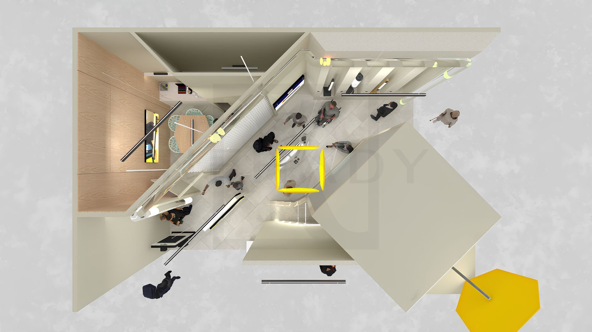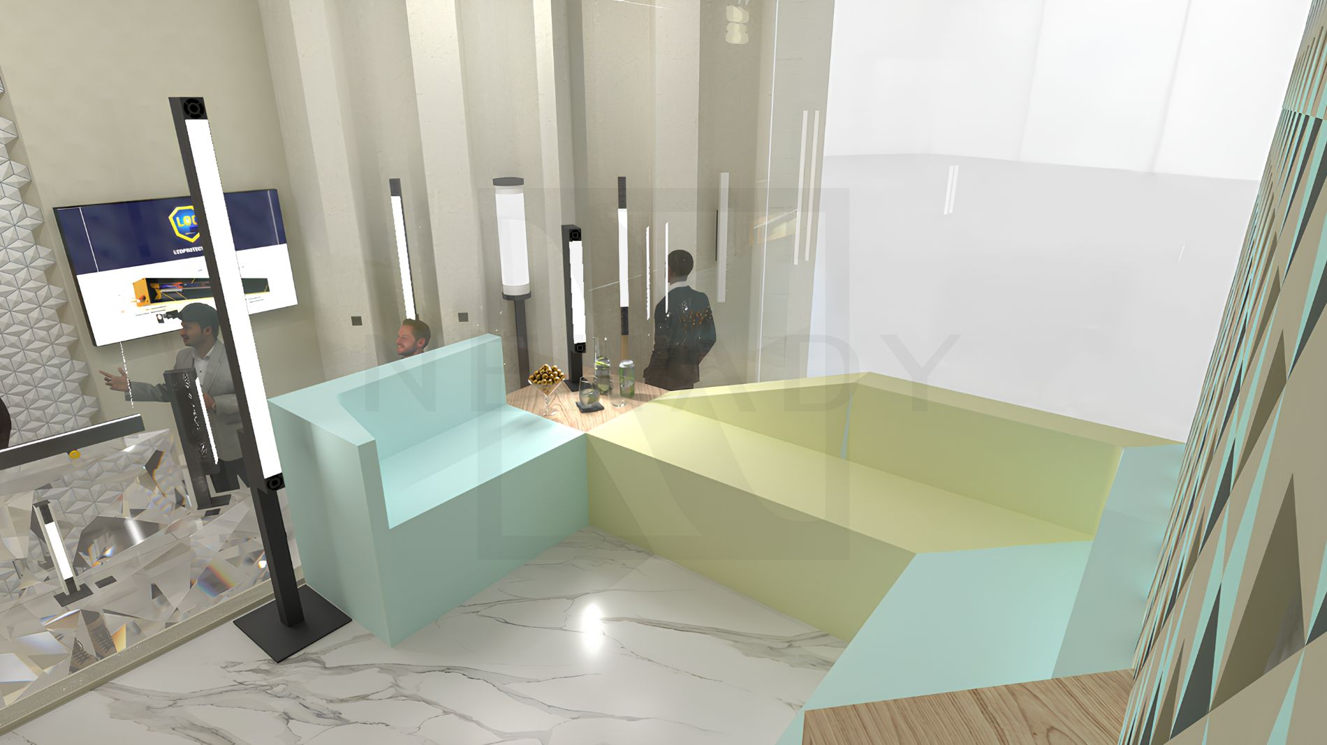 - Un espace VIP surélevé à 1 mètre du sol avec des vitres opacifiantes, accessible depuis un escalier transparent lumineux,