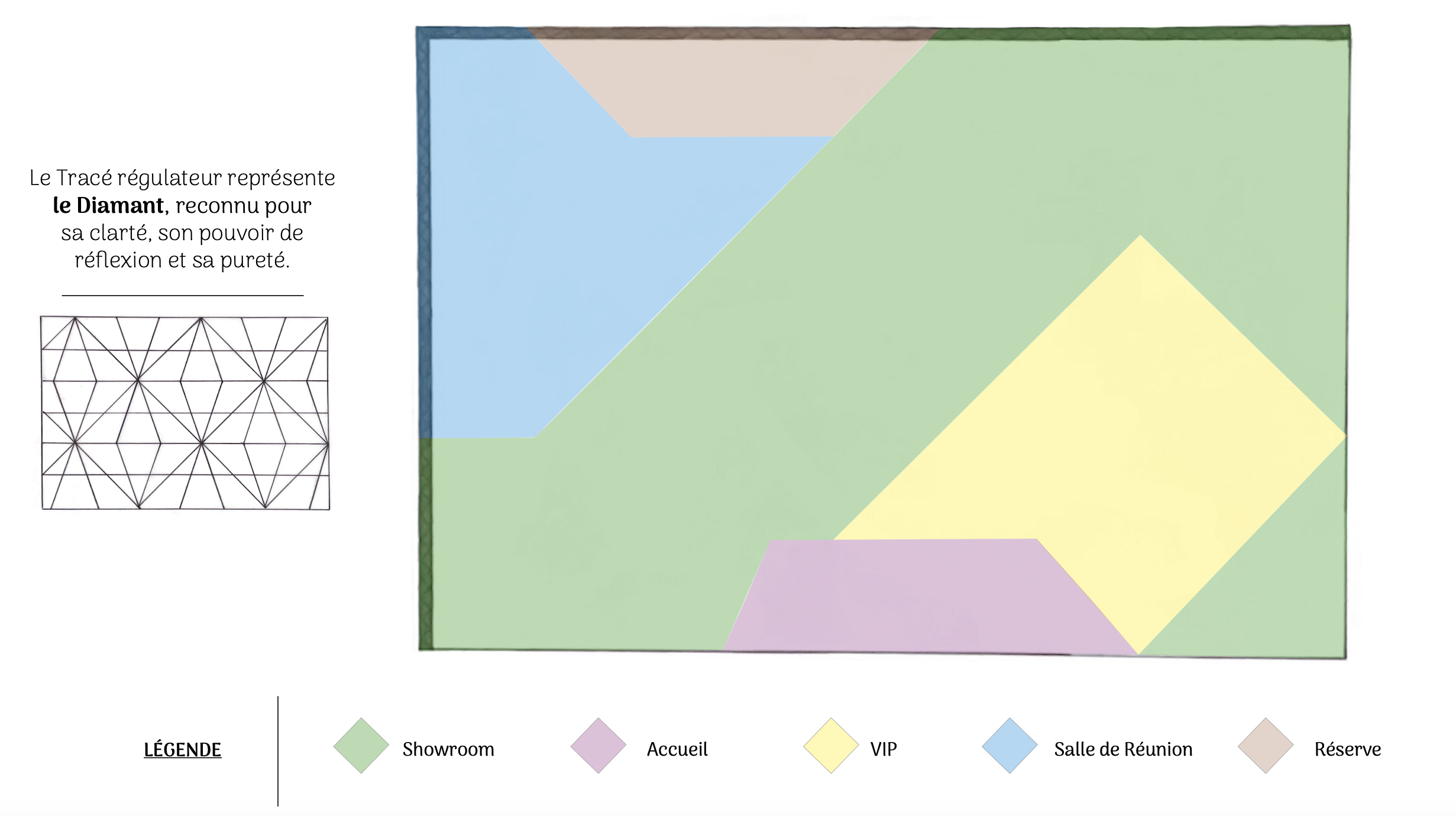 Le stand, basé sur un tracé régulateur en diamant, propose :