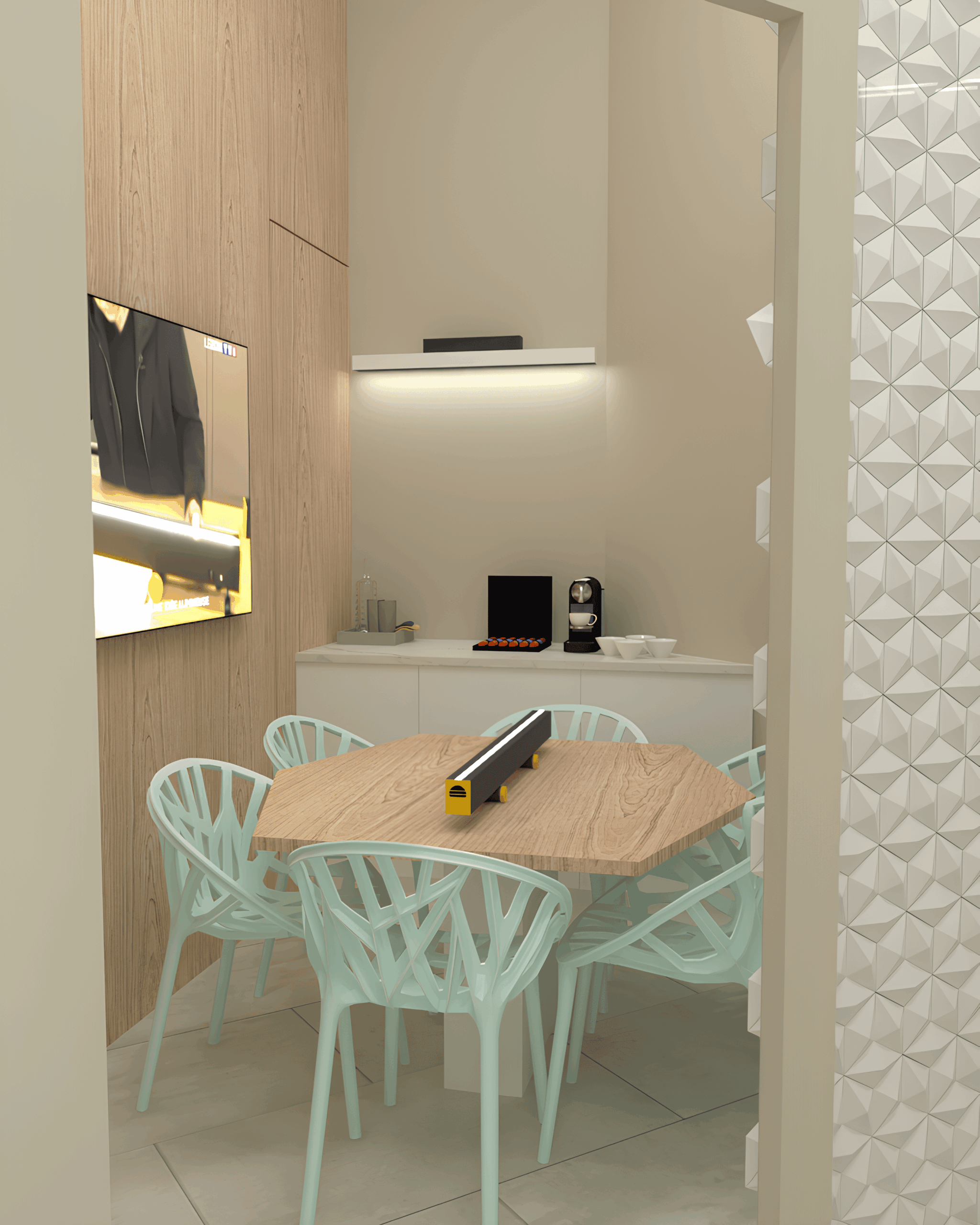 - Une salle de réunion vitrée avec mobilier géométrique et séparateur modulable pour plus de confidentialité,
