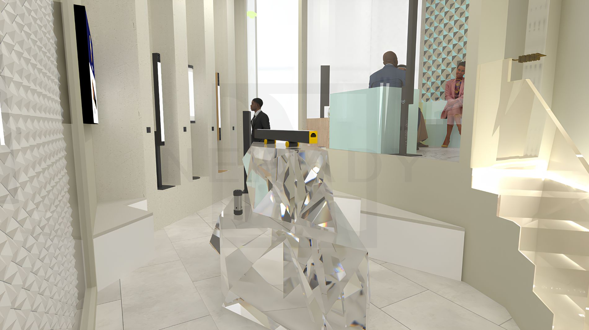 - Une banque d'accueil et un présentoir en forme de diamant,