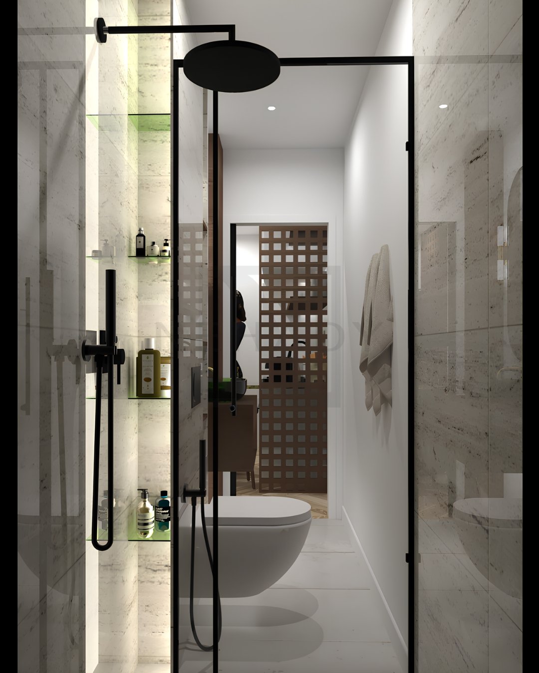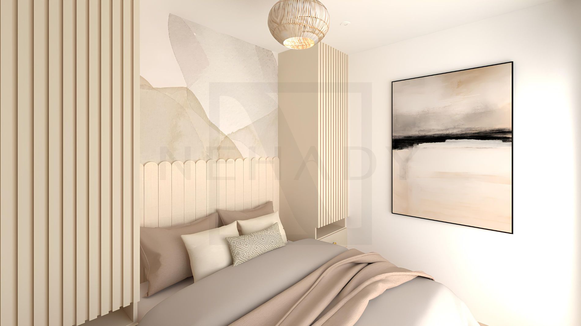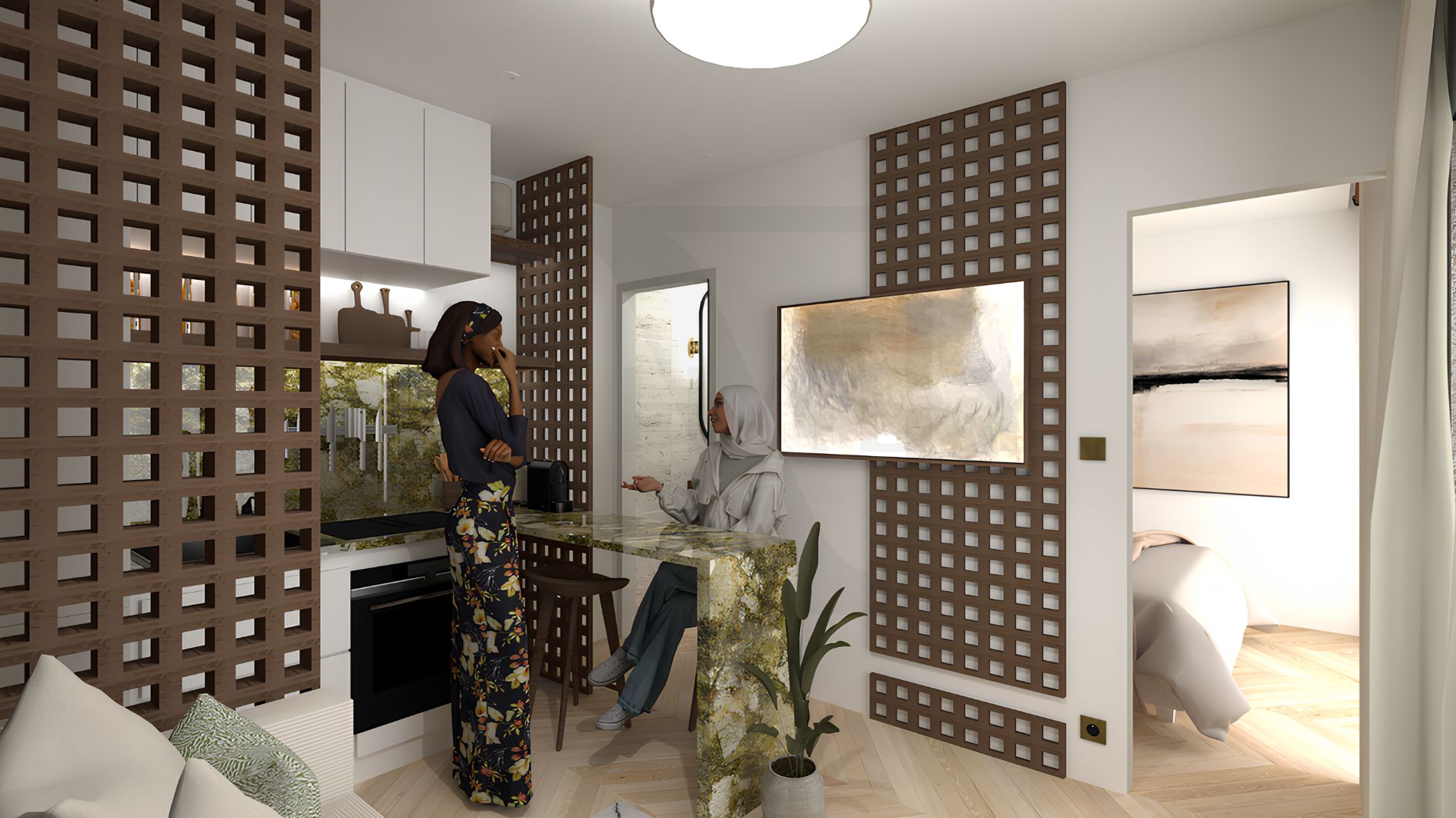 Des claustras en bois rythment l'espace avec légèreté et les teintes naturelles participent à une ambiance douce, contemporaine et apaisante.