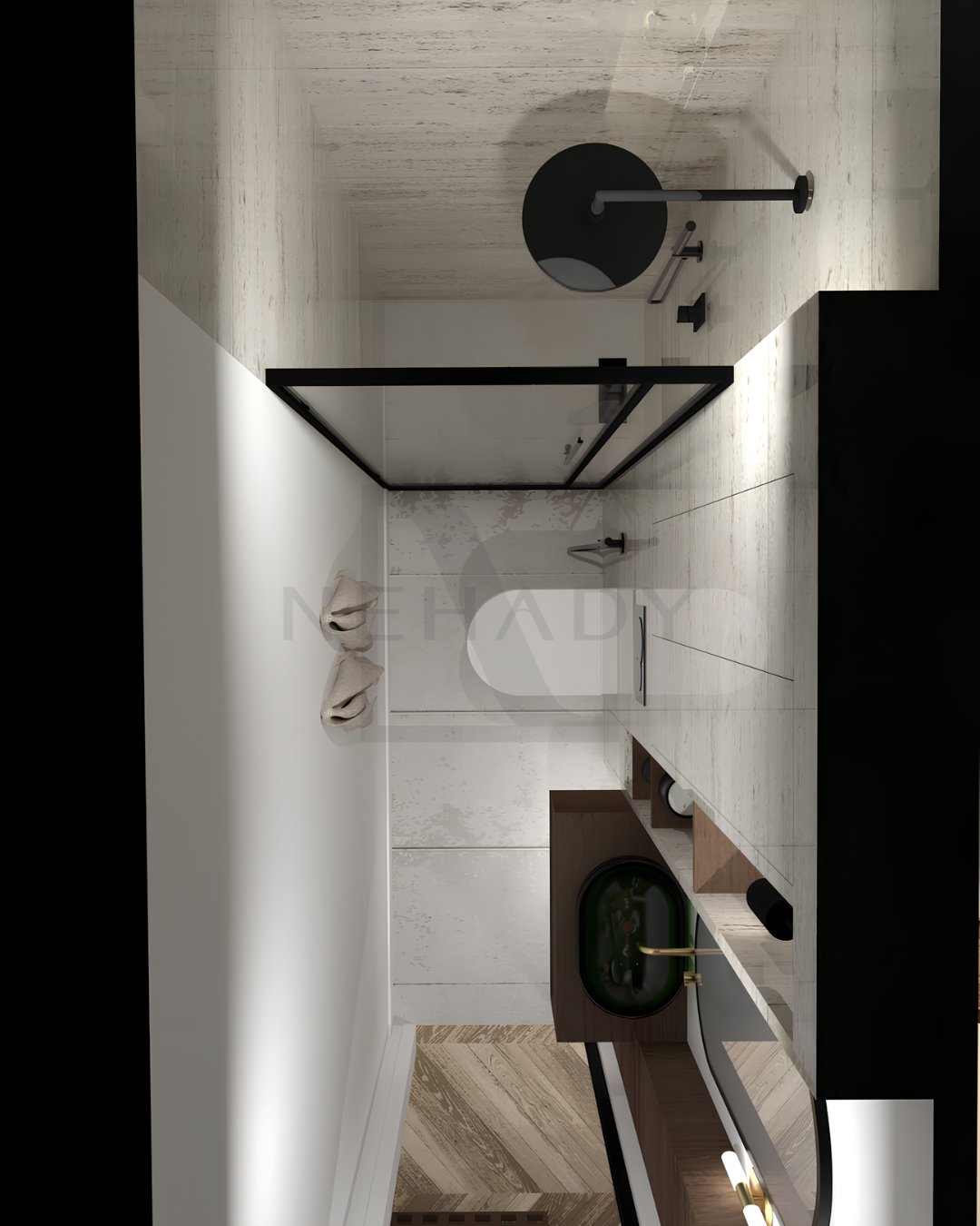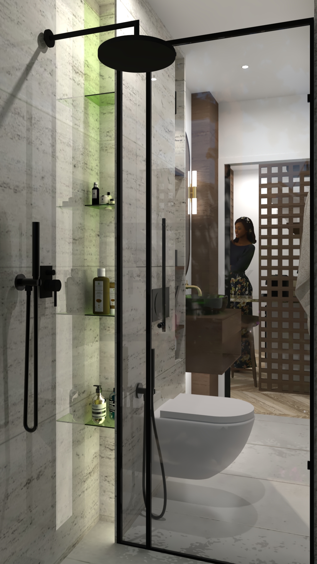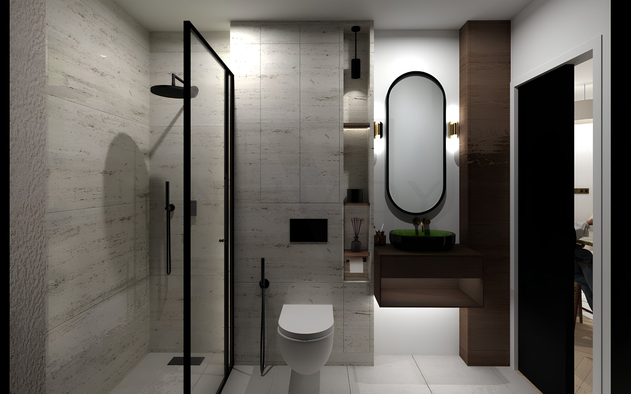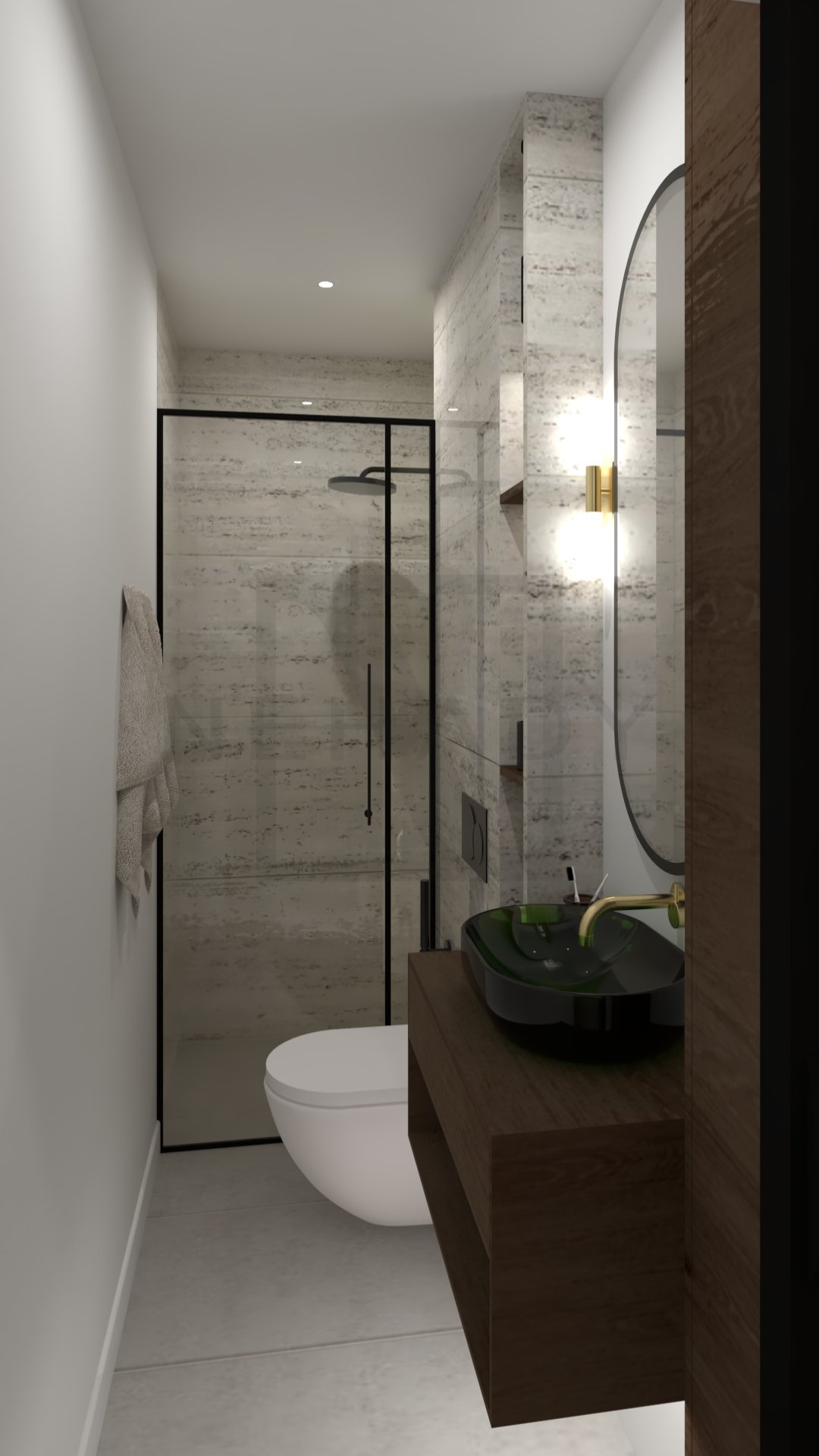 La salle de bain met en valeur l'association de textures minérales et finitions contrastées. Le travertin, la vasque en acrylique vert et le laiton doré reflètent une atmosphère apaisante et raffinée.