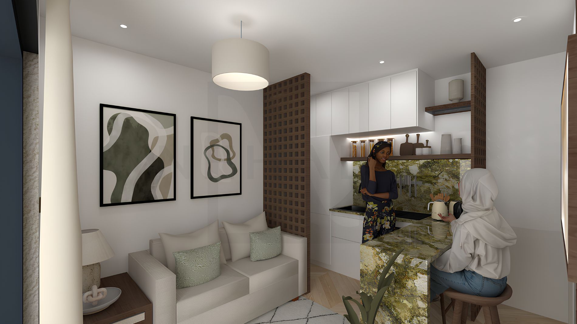 L'aménagement met à profit chaque mètre carré afin de créer un espace de vie chaleureux et optimisé. Une chambre séparée apporte un confort rare pour ce type de surface, tandis que la cuisine, semi ouverte sur le séjour, s'articule autour d'un ilôt en marbre verdâtre qui fait office de table à manger ou de bureau.